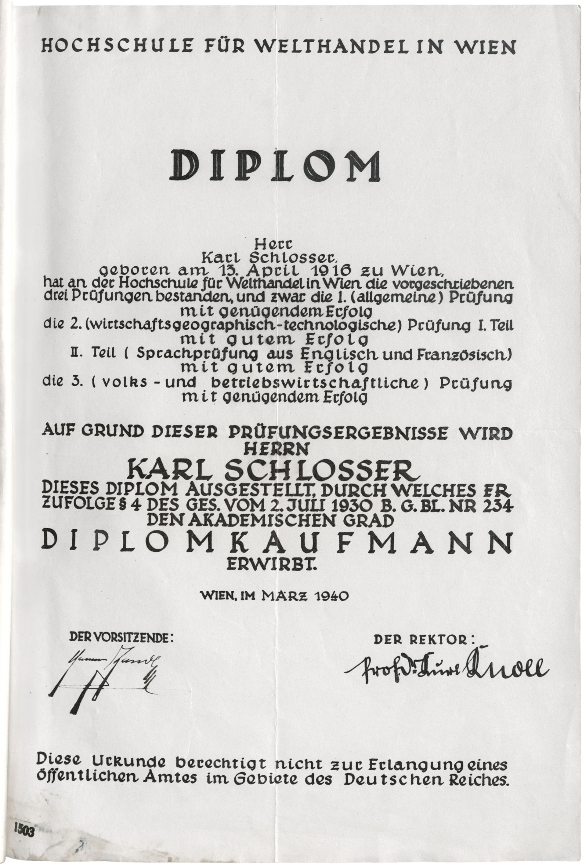 Stattdessen inskribierte Karl Schlosser im Wintersemester 1938/39 an der Hochschule für Welthandel. Hier war er bis einschließlich Herbsttrimester 1939 nominell für jene sechs Semester eingeschrieben, die der Diplomstudiengang regulär dauerte; dabei wurden ihm drei Semester seines Jus-Studiums an der Universität Wien angerechnet. Während er vor und unmittelbar nach dem Militärdienst in der Wohnung seines Vaters in der Mayerhofgasse 1/18 (4. Bezirk) gewohnt hatte, war er ab Juli 1938 in der Taubstummengasse 8/7 (4. Bezirk) gemeldet, wo er die Wohnung mit seiner Schwester Elfriede teilte. Mindestens aus der Rückschau mutet eigenartig an, dass Karl, der gemäß nationalsozialistischer Doktrin als ‚Halbjude‘ galt und sich später aktiv am Widerstand gegen das NS-Regime beteiligen sollte (siehe unten), seine freie wissenschaftliche Arbeit, die Teil der Diplomprüfung war, bei Professor Ernst Beutel (1877–1944) schrieb, einem ferventen Nationalsozialisten. Bevor ihm der Titel des Diplomkaufmanns verliehen wurde, musste sich Schlosser, wie dies bei allen ‚Mischlingen‘ auf der Grundlage eines Erlasses des Ministeriums für innere und kulturelle Angelegenheiten üblich war, dem Ausschluss von allen öffentlichen Ämtern auf dem Gebiet des Deutschen Reiches „unterwerfen“. Auch die Diplomurkunde, die am 15. März 1940 ausgestellt oder versandt und vom ebenfalls radikalen NS-Rektor Kurt Knoll (1889–1959) unterschrieben wurde, hielt unmissverständlich fest, dass sie „nicht zur Erlangung eines öffentlichen Amtes im Gebiete des Deutschen Reiches“ berechtige. Überdies war Schlosser – wie viele andere ‚Mischlinge‘ – ohnehin nur „unter Vorbehalt“ zum Studium zugelassen gewesen.