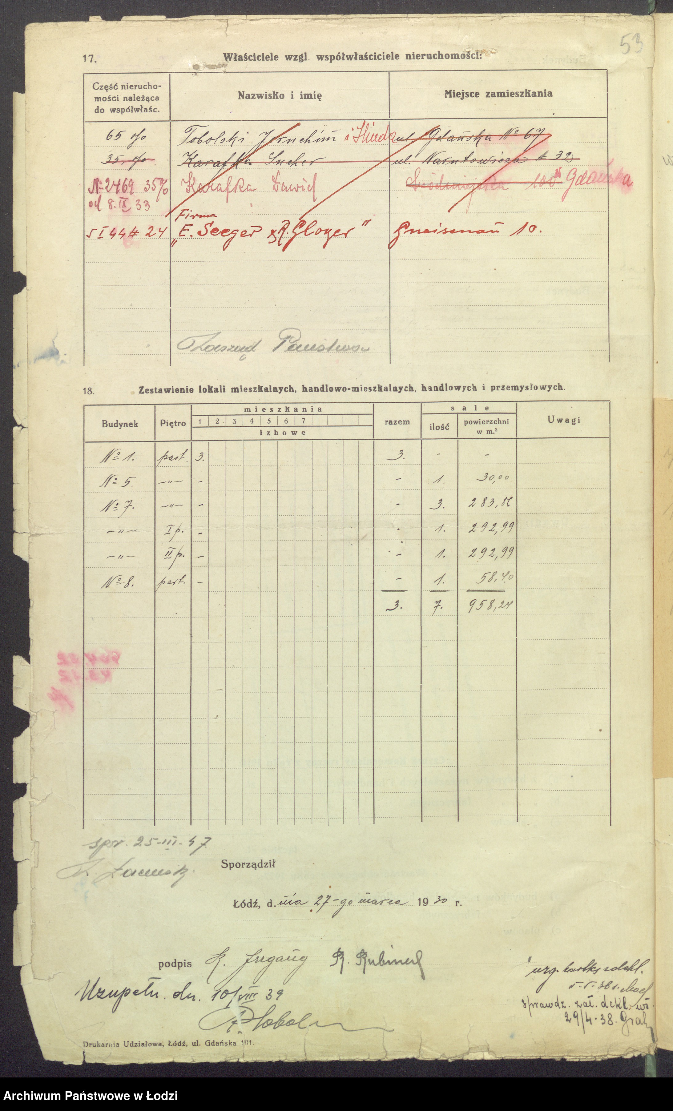 Archiwum Państwowe w Łodzi: Akta miasta Łodzi, Zarząd Miejski w Łodzi 1915-1939, Wydział Podatkowy, sygn. 16255, Księga inwentarzowa nieruchomości m. Łodzi ul. Żeligowskiego z lat 1930-1947, strona 53 [Staatsarchiv Lodz, Akten der Stadt Lodz, Stadtverwaltung Lodz 1915–1939, Steuerabteilung, Sign. 16255, Inventarbuch der Immobilien der Stadt Łódź zur Ulica Żeligowskiego 1930–1947, Bl. 53, Eintrag vom 27.03.1930 mit späteren Modifikationen].
